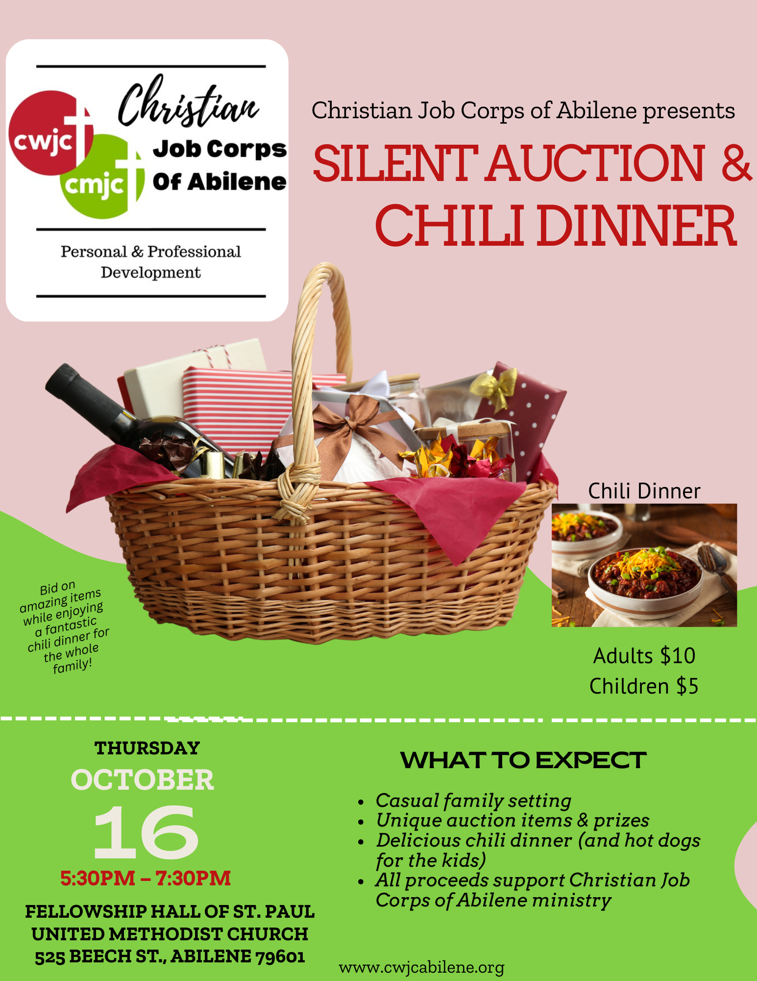 We are so thrilled that you are able to join us for our first silent auction and chili dinner! Please fill out this form, click submit, and you will receive a receipt at the email address you provided. Thank you for supporting our mission at Christian Job Corps.